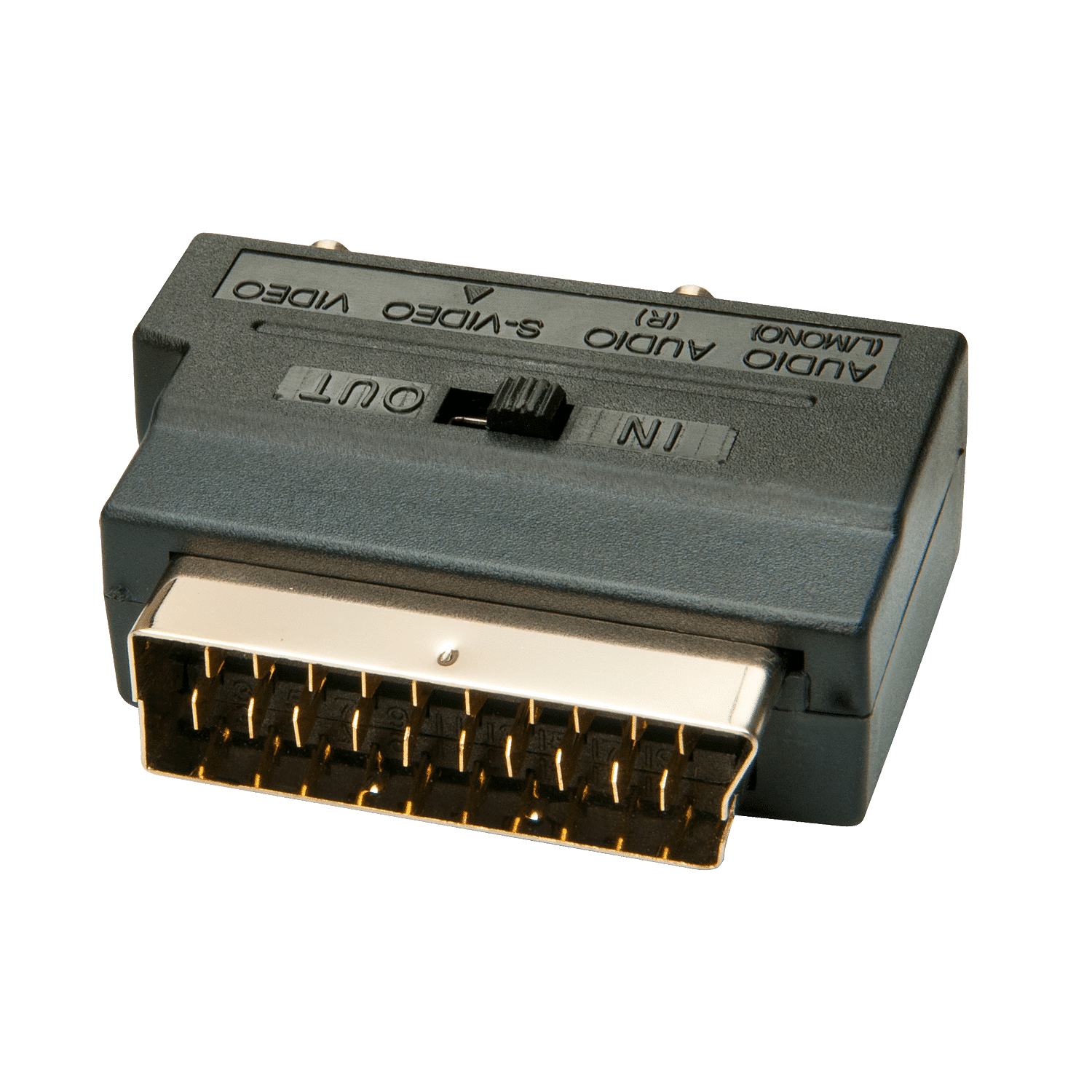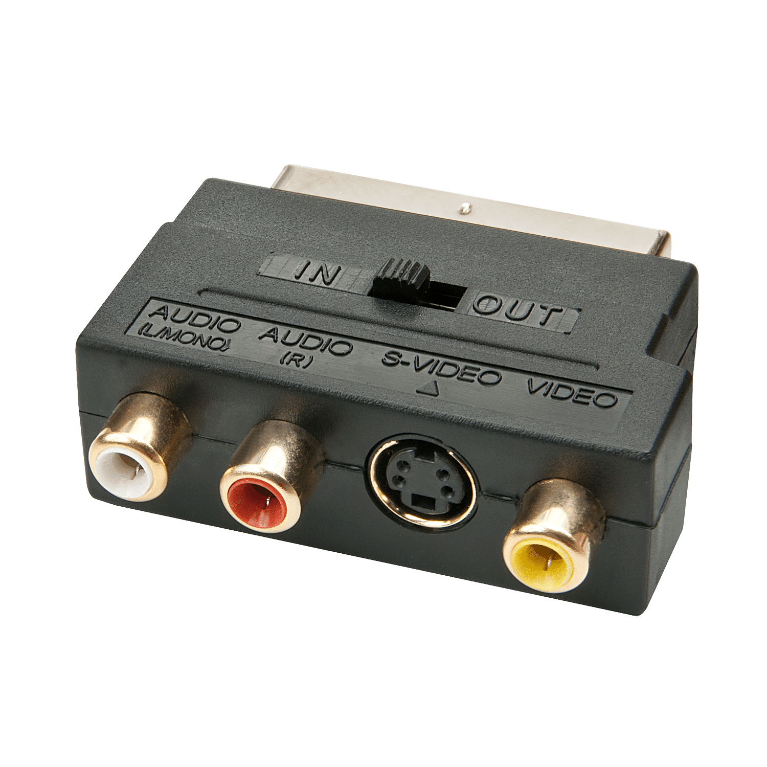 Adaptateur péritel vers S-Vidéo et AV, avec commutateur pour le sens du signal. Connectique péritel 21 pins vers S-Vidéo (mini DIN 4) et 3x RCA femelles