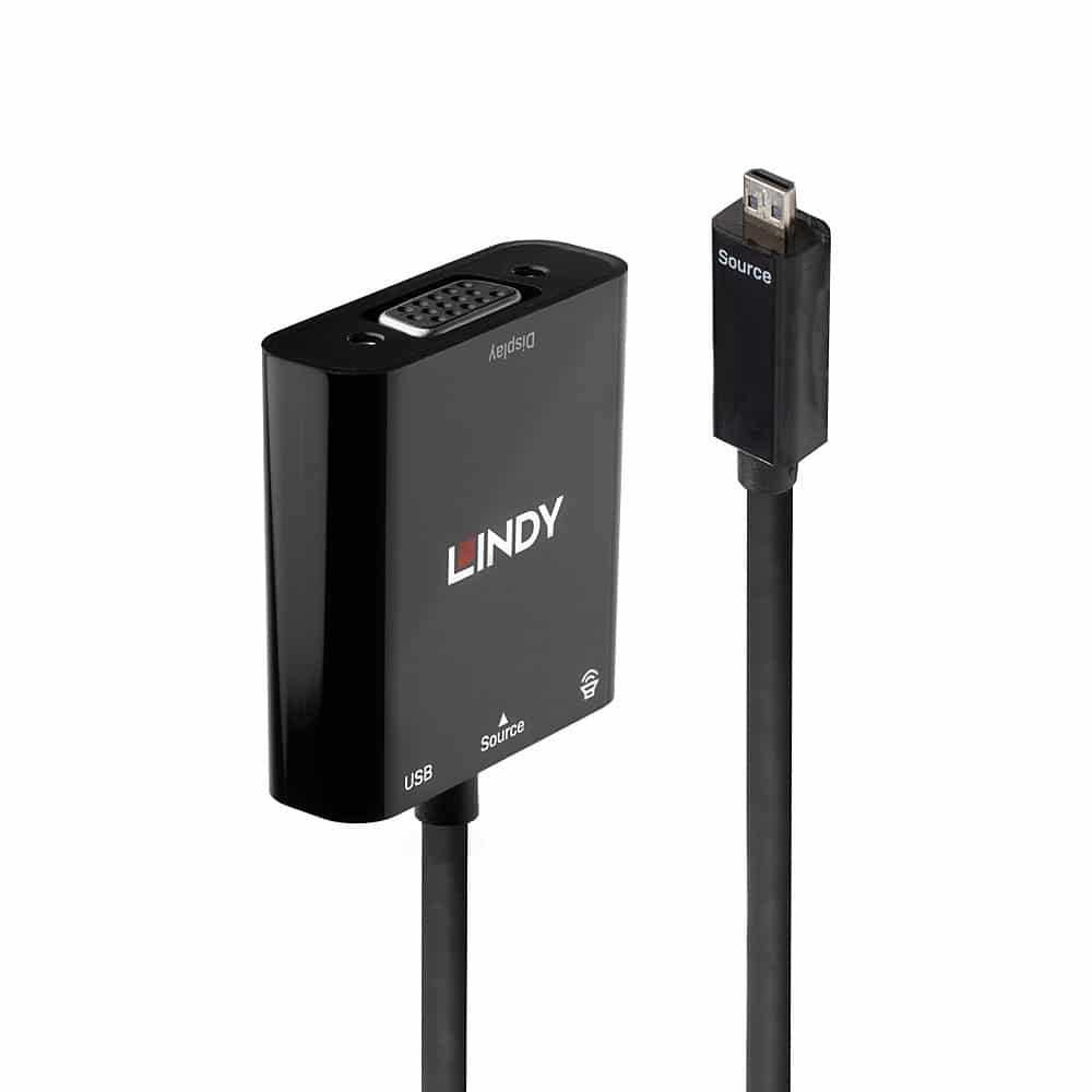 Le convertisseur Mini HDMI vers VGA et Audio de LINDY est idéal pour connecter des sources équipées en HDMI C telles que les ordinateurs portables, ultrabooks et PC à des écrans VGA, avec un port 3.5mm séparé pour une connexion avec des haut-parleurs analogiques. Il convertit le signal HDMI (ainsi que le flux audio numérique associé) en un signal VGA analogique, extrayant simultanément l'audio pour une connexion avec des haut-parleurs stéréo. Les signaux Full HD sont pris en charge, y compris 1080p pour les connexions HDTV et jusqu'à 1920×1080 pour les moniteurs PC VGA.