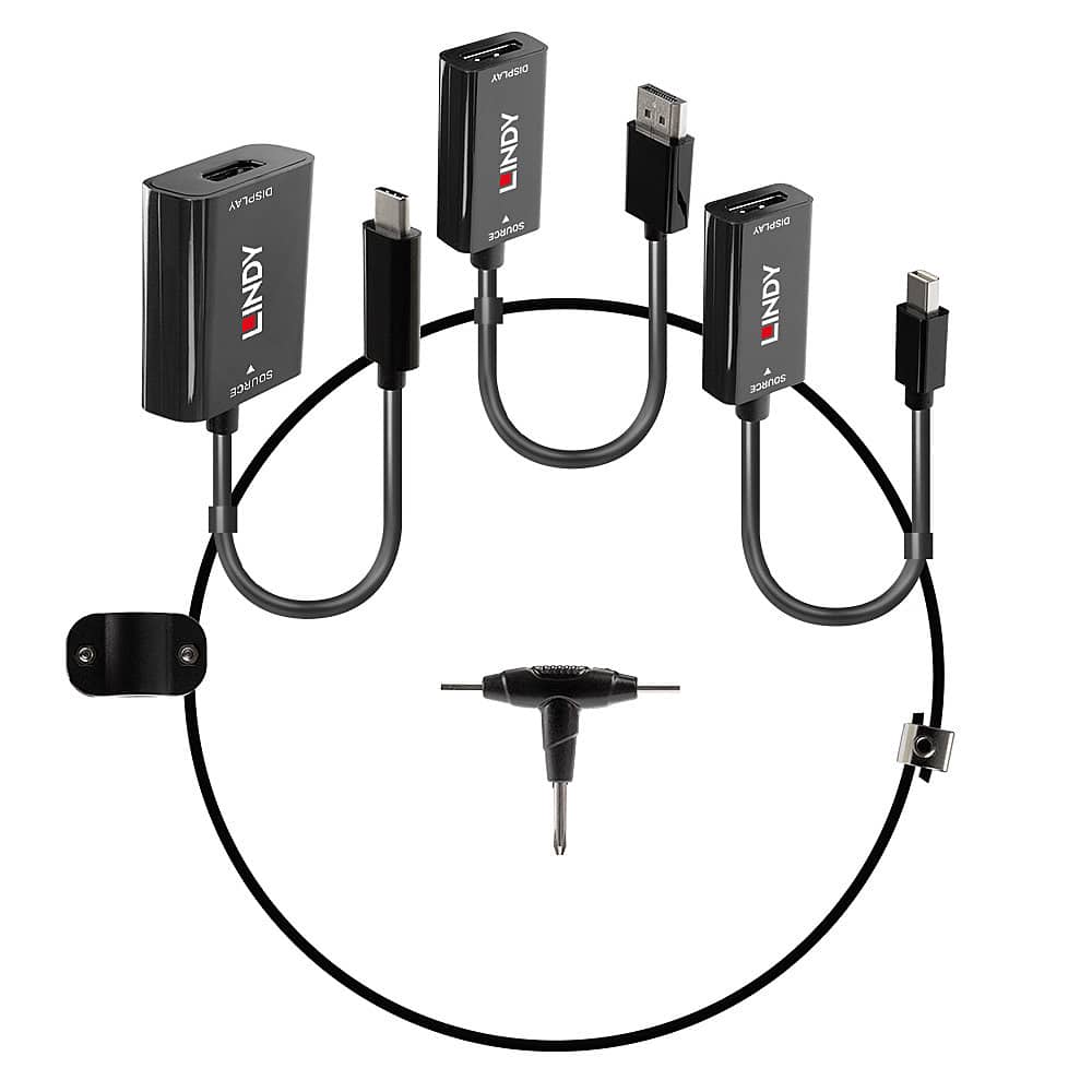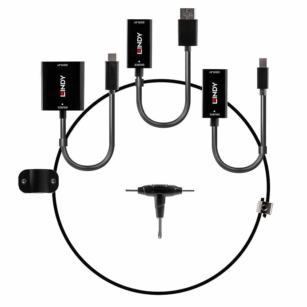 Le câble de conversion USB de type C, mDP et DisplayPort vers HDMI 18G de LINDY est une solution multi-AV supérieure avec des convertisseurs USB de type C, Mini DP et DisplayPort vers HDMI séparés, tous fixés solidement à un câble en acier inoxydable de 15 cm de diamètre pour un accès facile en cas de besoin. Grâce à un serre-câble intégré qui s'adapte au câble HDMI* de l'écran, ce câble est parfait pour les présentations ou les environnements collaboratifs où différents utilisateurs disposent d'une variété de périphériques et de connexions. Les adaptateurs sont ainsi fixés en place, prêts à être utilisés par le prochain utilisateur.