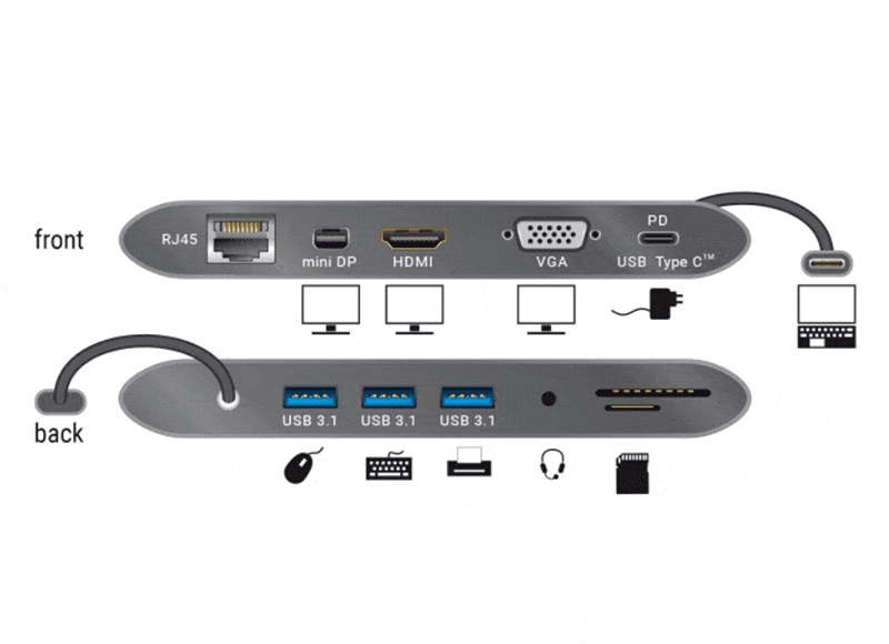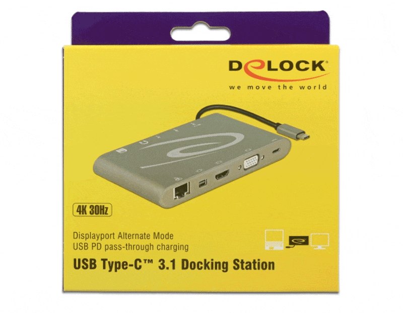 En utilisant le mode DisplayPort Alternate via son port USB Type C, la station permet de connecter deux moniteurs à un ordinateur portable compatible via HDMI et/ou DisplayPort et/ou VGA. Lors de l'utilisation d'un seul moniteur, des résolutions allant jusqu'à Ultra HD 4K 30Hz peuvent être affichées sur l'interface HDMI ou DisplayPort et jusqu'à 1920×1200 sur l'interface VGA. En cas d'utilisation d'un affichage double, la résolution maximale est de 1920×1080 60Hz.