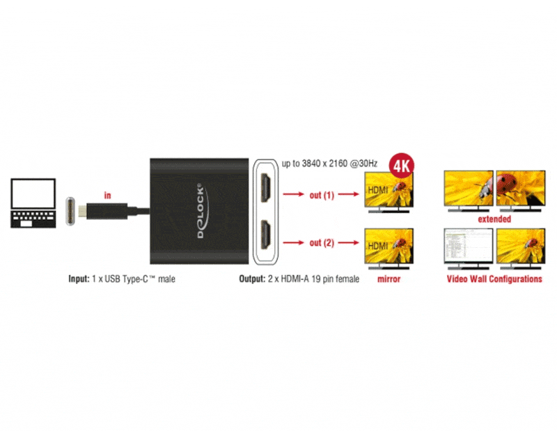 Cet adaptateur de Delock est approprié à la connexion d'un moniteur VGA ou HDMI ou DVI à un ordinateur ayant une interface USB-C et un support de mode alternatif DisplayPort. L'adaptateur peut donc être connecté à différents ordinateurs portables tels que les MacBook, Chromebook et similaires. De plus, l'adaptateur peut également fonctionner sur une interface Thunderbolt 3. Un seul moniteur peut être utilisé sur l'adaptateur.