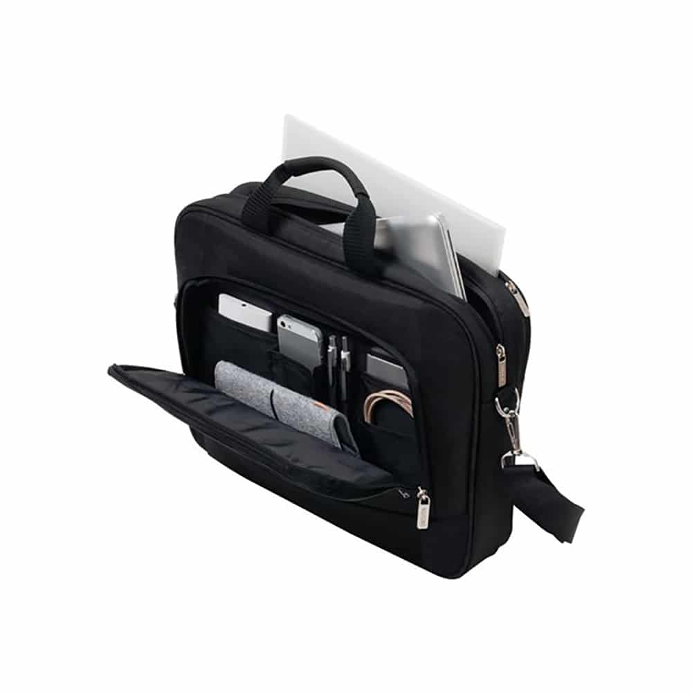Profitez de la vie grâce à Top Traveller BASE! Cette sacoche Toploader très maniable protège votre ordinateur de façon optimale grâce à son compartiment rembourré et à son cadre en métal renforcé. Ce poids plume vous garantit une mobilité flexible pour votre vie personnelle et professionnelle. Votre ordinateur est protégé de façon optimale par le rembourrage en mousse haute densité. De plus, la sacoche offre de la place pour vos documents. Vous pouvez ranger vos accessoires mobiles dans la poche avant. Toutes vos affaires importantes sont ainsi à portée de main en permanence. La bandoulière est amovible et de longueur réglable. Grâce à sa poignée rembourrée en néoprène, la sacoche tient bien en main et se fixe au trolley un clin d’œil grâce à sa sangle intégrée: un accessoire intelligent dans la catégorie poids plume!