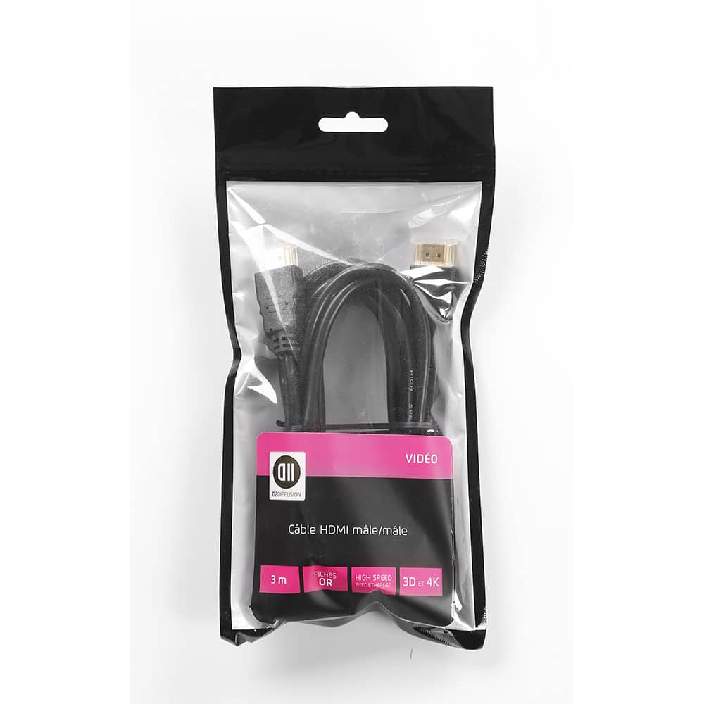Câble HDMI mâle/mâle 3m noir, plaqué or, 4K, AWG 30 vendu en SACHET