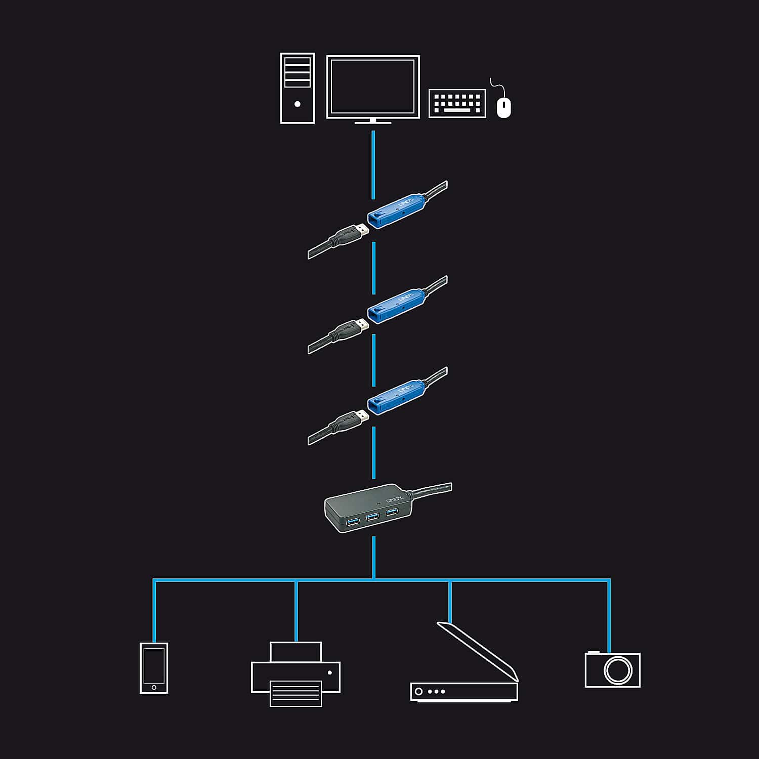 Une fois ce premier câble connecté, vous pouvez cascader d’autres rallonges actives pour atteindre jusqu’à 40 mètres. Le segment final peut être composé d’une des trois références. Si vous devez connecter plusieurs périphériques ou si les périphériques nécessitent plus de courant d’alimentation, vous pouvez utiliser en dernier segment le modèle avec hub 10m (Nr. 43159) avec son alimentation.