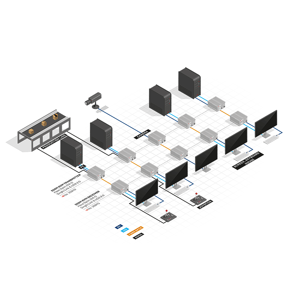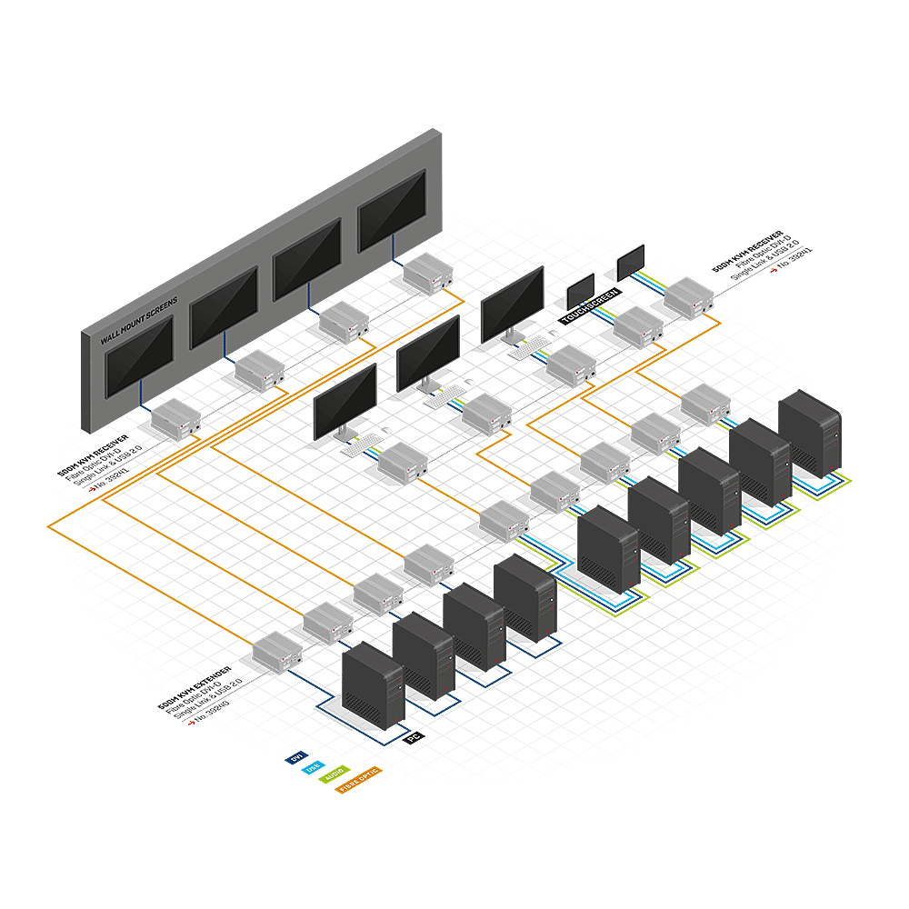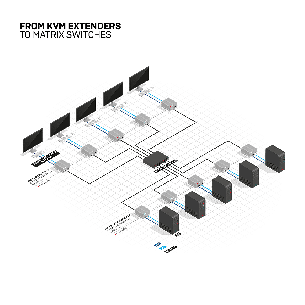 Reçoit un signal DVI-D Single Link et USB 2.0 jusqu’à 500m – avec options audio, média de stockage USB, VGA et RS232 – nouvelle version avec option KVM Matrix Switching