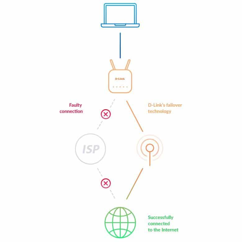 Le routeur sans fil AC1200 4G LTE Cat.4 DWR-953V2 vous permet de basculer en toute transparence vers un réseau de secours Internet mobile 4G LTE lorsque votre connexion Internet haut débit tombe en panne, afin que vous puissiez continuer à utiliser Internet sans interruption.