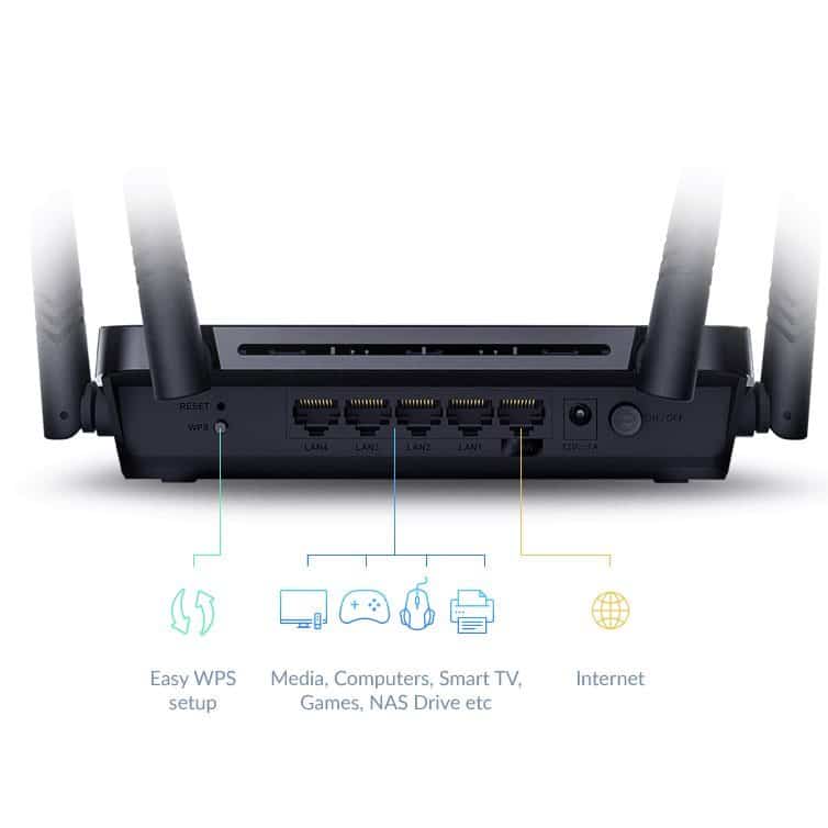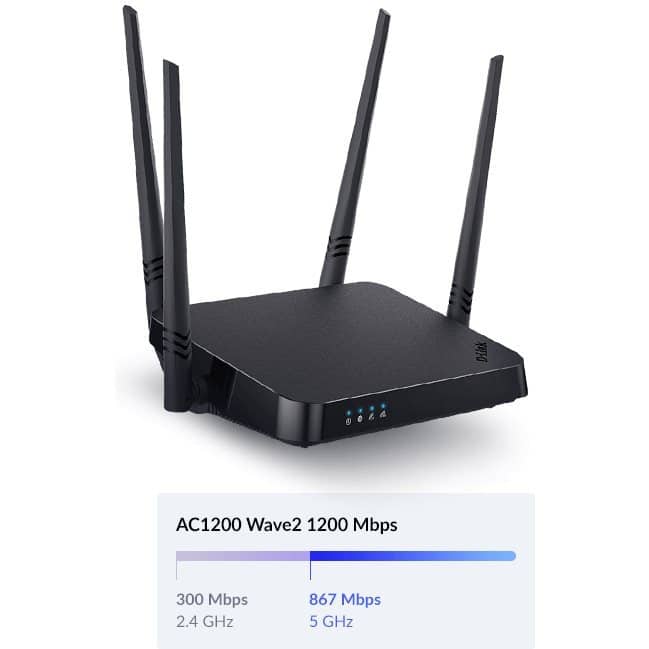Routeur Wireless AC1200 Wave 2 Dual Band Gigabit – Antennes externes – 802.11ac 5GHz 867Mbps max – IEEE 802.11n 2.4GHz 300Mbps max – Mu-MIMO – 5 ports Giga, 1 WAN – 4 LAN – WPA2/WPA3