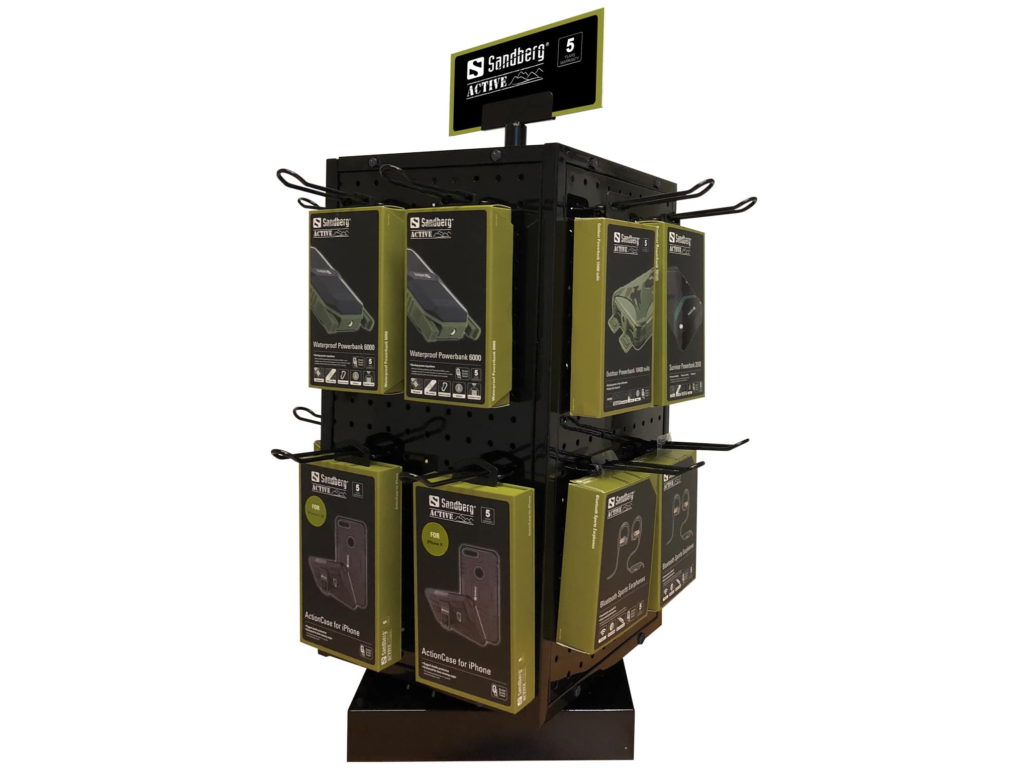 Foursided rotatable shop counter display for Sandberg products. Solidly constructed in metal pegboard on a strong base. Includes 25 hooks and changeable top signs for Sandberg Home & Office, Sandberg Active and Sandberg EsportsEquipment. This display is a perfect space-saving way to present Sandberg products in your shop, and to have customers making impulse buys.
