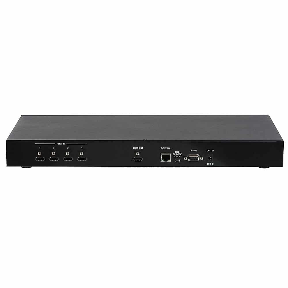 Ce processeur vidéo et Switch Scaler combine 4 signaux d'entrée HDMI vers un signal de sortie HDMI. Il est largement configurable et offre une grande variété d'options d'affichage.