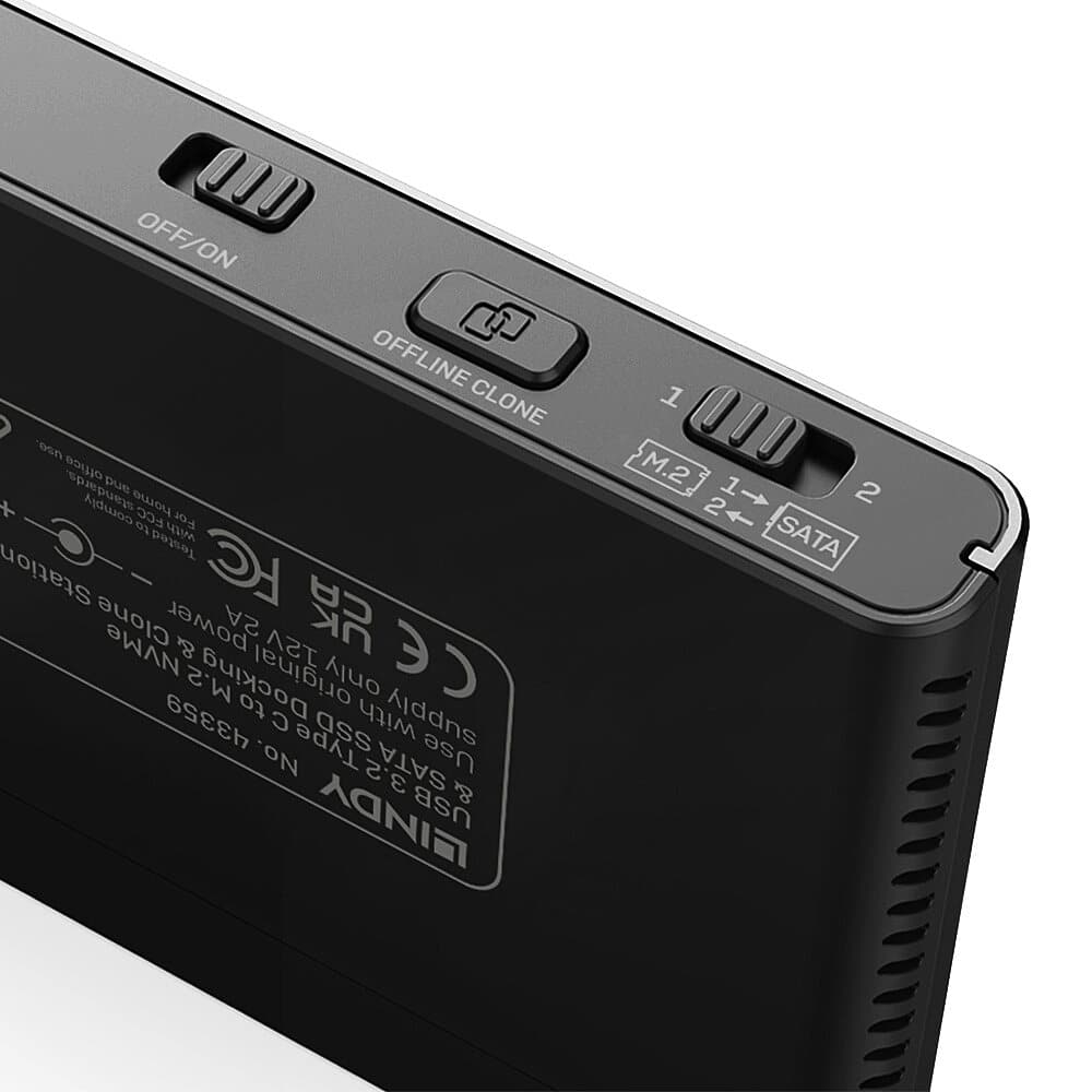 La station d'accueil et de clonage USB 3.2 Gen 2 Type C M.2 NVMe & SATA SSD/HDD de Lindy offre des fonctions d'accueil et de clonage à grande vitesse. Elle prend en charge la lecture et l'écriture simultanées sur un SSD M.2 NVMe et un SSD/HDD SATA, ainsi que le clonage hors ligne (copie de données sans connexion à un ordinateur hôte) d'un SSD M.2 NVMe vers un SSD ou un disque dur SATA 2,5" ou 3,5", et inversement.