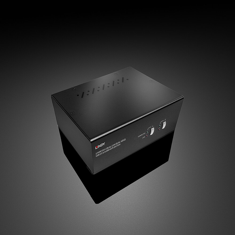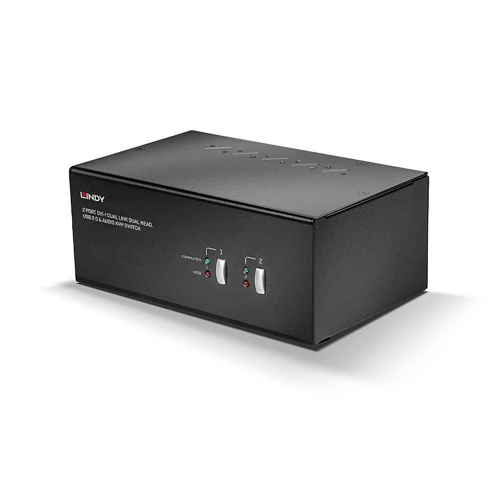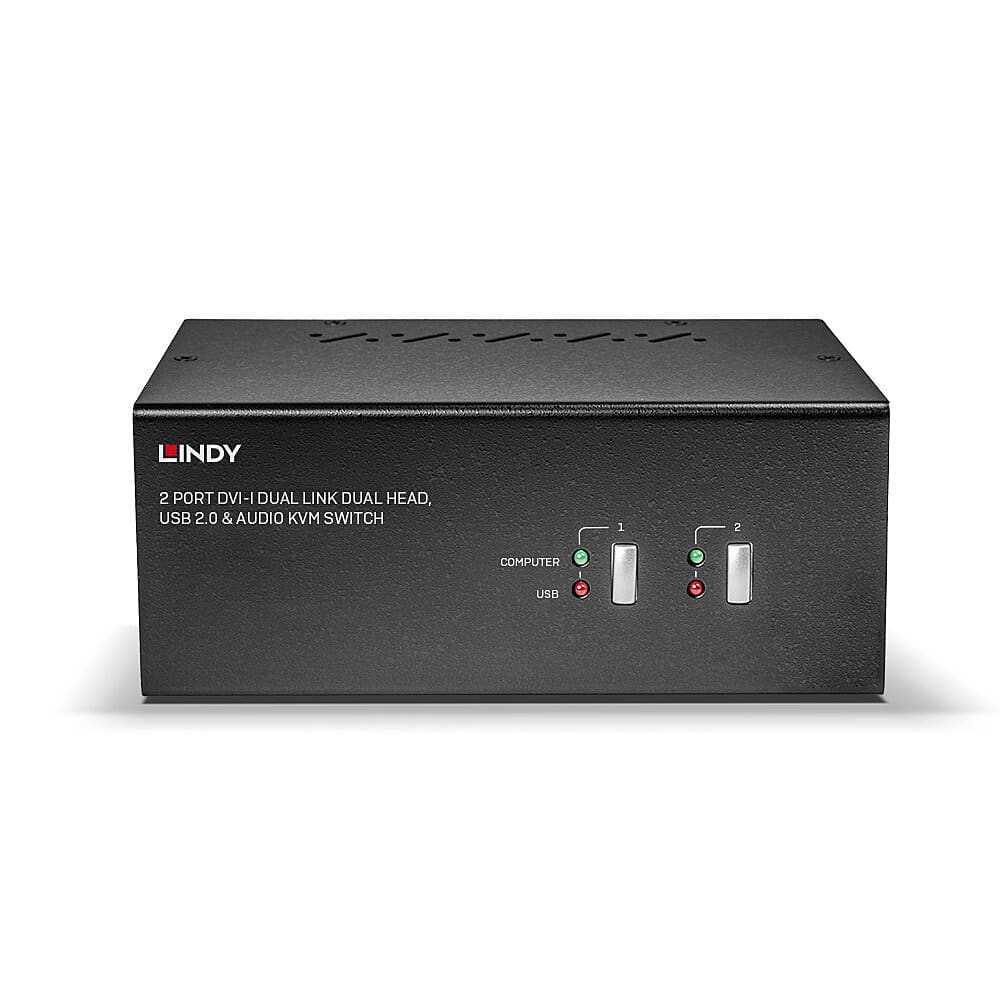 Le Switch KVM DVI-I Dual Link Dual Head, USB 2.0 & Audio, 2 ports de LINDY est une solution compacte permettant l'accès et le contrôle de deux PC équipés de deux sorties DVI à partir d'un clavier, d'une souris et de deux écrans.