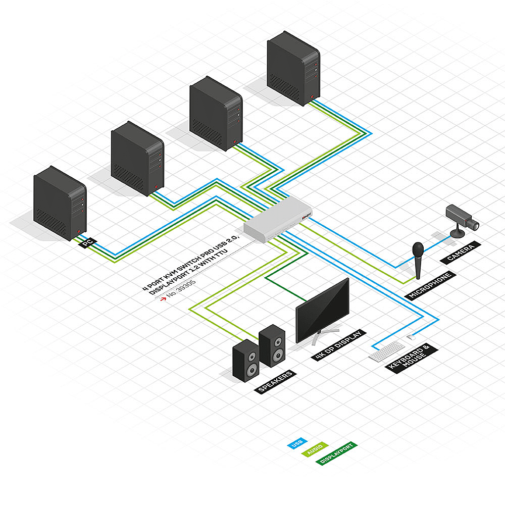 - Contrôle de quatre PC équipés en DisplayPort à partir d'un ensemble clavier, souris et écran