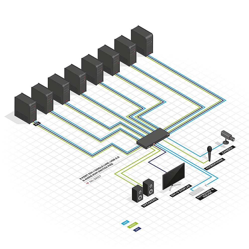 - Prend en charge jusqu'à 8 ordinateurs équipés de ports USB, DVI et audio