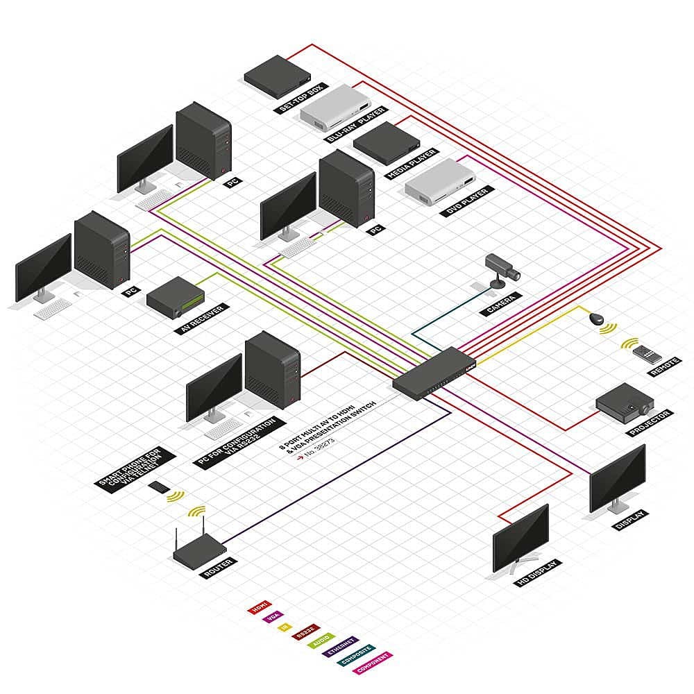 Doté de 8 entrées AV qui peuvent être converties et mises à l'échelle jusqu'à une résolution Full HD 1080p, ce commutateur et convertisseur AV est un complément idéal à toute salle de réunion ou de conférence, salle de conférence ou auditorium. N'importe laquelle des entrées disponibles (3 x HDMI, 3 x VGA & Audio, Vidéo Composante & Audio et Vidéo Composite & Audio) peut être affichée simultanément sur les afficheurs connectés à chacune des sorties (2 x HDMI et VGA). Ces trois sorties offrent une compatibilité avec les écrans AV contemporains et anciens et peuvent être combinées avec des extensions Lindy HDMI ou VGA pour atteindre des écrans distants.